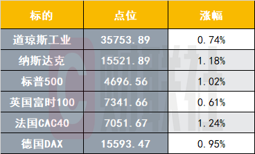 美东时间周三,三大指数集体收高,截至收盘,道琼斯指数涨0.74%,报35,753.89点;标普500指数涨1.02%,报4,696.56点;纳斯达克指数涨1.18%,报15,521.90点。大型科技股集体走高,新能源汽车股多数收涨,热门中概股多数下挫。