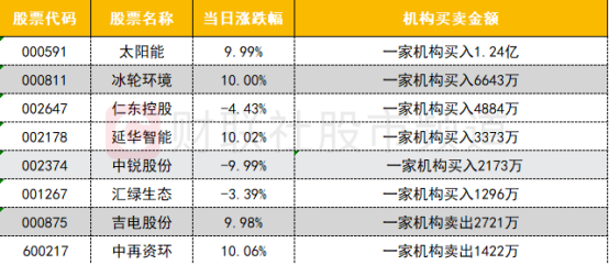 今日龙虎榜机构以净买入居多,主要以绿电概念股和高位股为主。其中绿电概念股太阳能获机构买入超1.2亿,氢能源概念股冰轮环境获机构买入超6000万。部分高位股虽然也获机构买入,但买入金额不大。