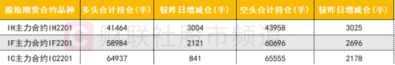 今日期指三大主力合约多空双方均以加仓为主,其中IH和IF主力合约多空双方加仓数量基本相当,但IC主力合约空头加仓数量明显大于空头,或是对中小盘股指数接下来的走势不看好。