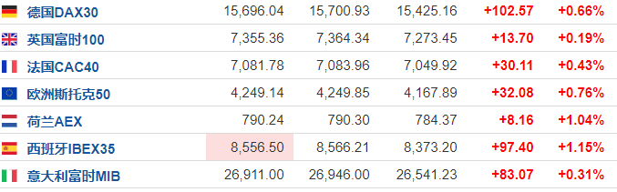正在交易中的欧洲市场也全线走高,德国DAX30指数上涨0.66%,英国富时100指数上涨0.19%,法国CAC40指数上涨0.43%。