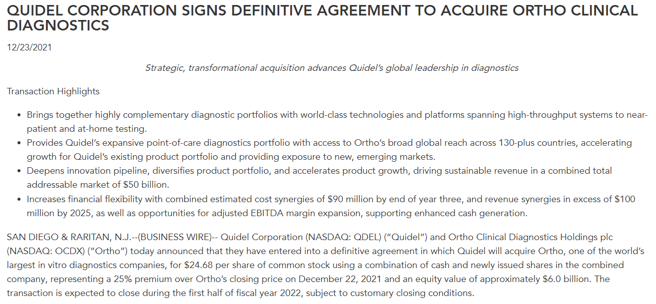 背靠凯雷集团的Ortho今年一月刚刚登陆美股市场,公司主营体外检测设备,提供诸如监测疾病进程、血型适配等解决方案,同时新冠检测工具也获得美国监管批准。根据收购协议,Quidel提出了一份每股等值24.68美元的收购方案,将以17.5亿美元现金和股票的方式进行。