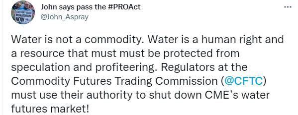 “水指数期货交易与公众利益相违背,因为它们涉及一种重要资源的交易,”Food & Water Watch写道。