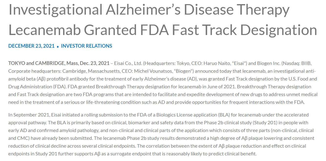 Lecanemab是一款人源性单克隆抗体,在今年早些时候也获得FDA“突破性疗法”的认定。“快速通道”机制主要用于快速审批治疗严重疾病的药物或疫苗,相关的制药企业也能够更加频繁地与监管展开磋商。