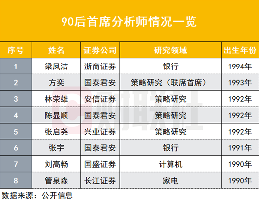 据不完全统计,卖方研究领域目前已经涌现了8位90后首席,除上文提及的梁凤洁、管泉森、林荣雄、刘高畅外,还包括国泰君安策略首席陈显顺(1992年)和联席首席方奕(1993年)、国泰君安证券银行首席张宇(1991年)、兴业证券策略首席张启尧(1992年)等。