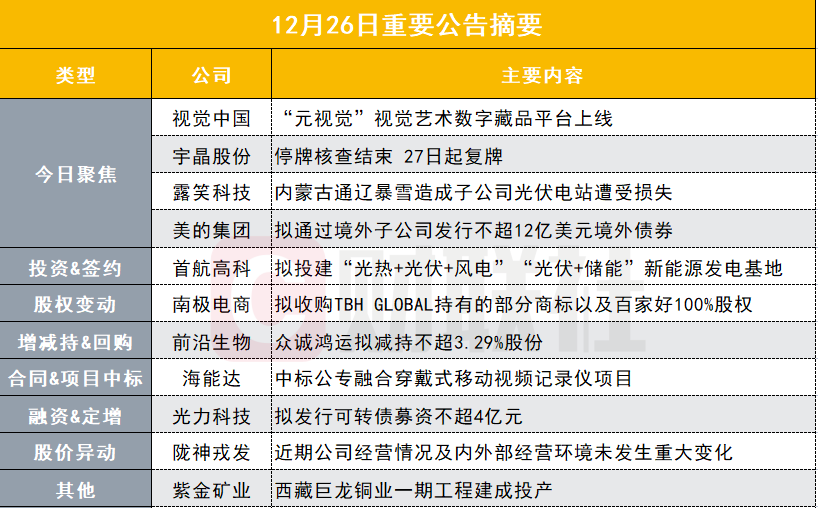 宇晶股份公告,公司就股票交易异常波动相关事项进行了核查。鉴于相关核查工作已全部完成,经公司申请,公司股票将于12月27日起复牌。