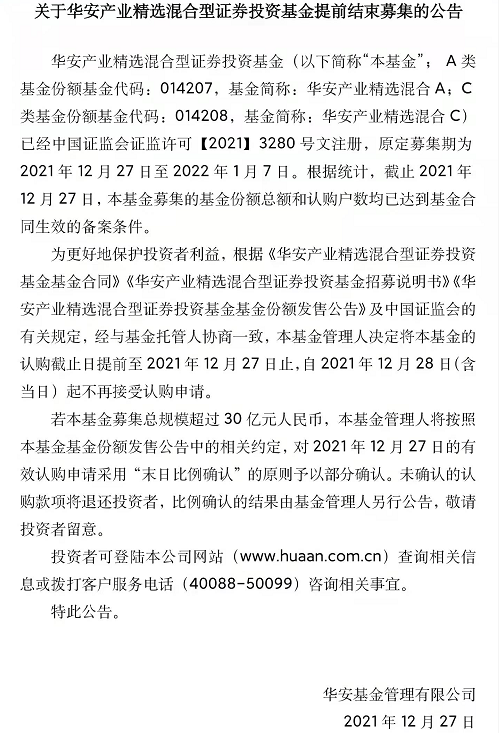 鉴于这一募集态势,华安产业精选也及时发布了提前结募的公告。公告显示,该基金原定于12月27日至1月7日募集。由于12月27日该基金募集总份额和认购户数均已达到基金合同生效的备案条件,故将其认购截止日提前至12月27日。若募集总规模超过30亿元,该基金将采取末日比例确认的原则对有效认购申请予以部分确认。