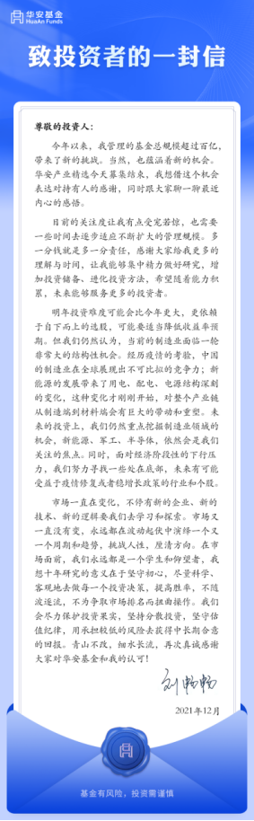 在华安产业精选结募后,刘畅畅在《致投资者的一封信》中袒露了今年以来管理总规模超过百亿后带来的挑战、压力与机会。她表示,目前的关注度让自己有点受宠若惊,也需要一些时间去逐步造应不断扩大的管理规模。“明年投资难度可能会比今年重大,更依赖于自下而上的选股。可能要适当降低收益率预期。”虽然如此,刘畅畅仍然认为,当前的制造业面临一轮非常大的结构性机会。