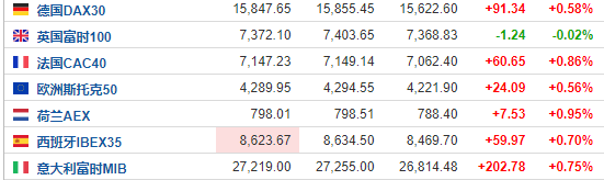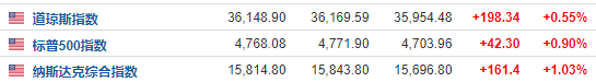 美股三大指数周一盘中集体上扬,截至发稿,道琼斯指数涨0.55%,标普500指数涨0.90%,纳斯达克指数涨1.03%。欧洲主要股指集体走高。