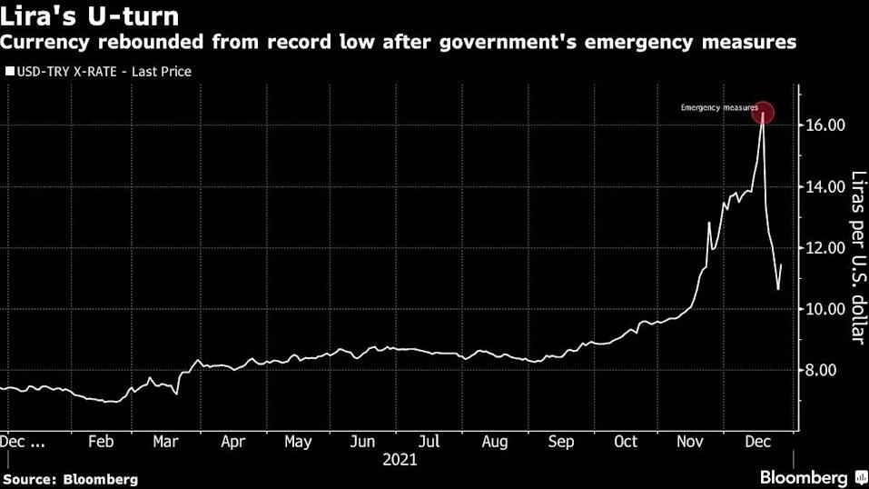 上周五,土耳其总统埃尔多安曾表示,在采取多项措施支持里拉,包括推出新工具来保护里拉存款持有人后,里拉币值将逐步稳定。