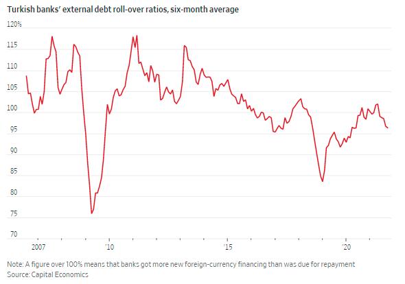 土耳其银行系统即将到期的美元债务的置换比率已跌破100%,意味着借来的新债少于现有的欠债。