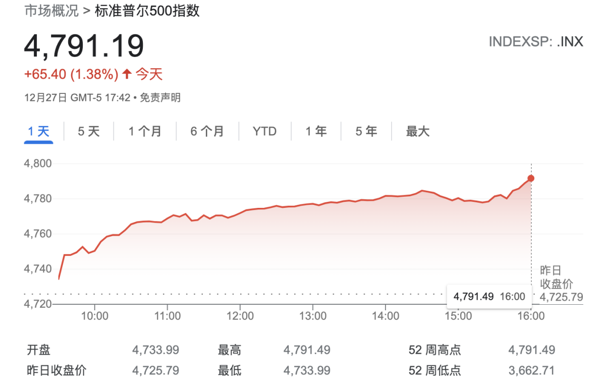 周一,标普500指数上涨1.38%,收于4791.19点,为年内第69次创收盘记录新高,也是2000年以来最好的圣诞行情开局。
