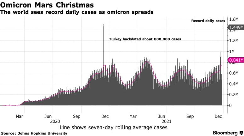 数据显示,在奥密克戎毒株加速传播之际,全球新冠确诊病例单日在周一(12月27日)新增超过144万例,打破了之前的纪录。其中美国单日新增病例超50万例,亦创下纪录新高。