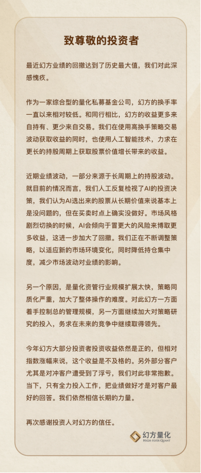 12月28日晚间,幻方量化在最新发布的《致尊敬的投资者》中,回应了近期产品业绩回撤达到了历史最大值一事。