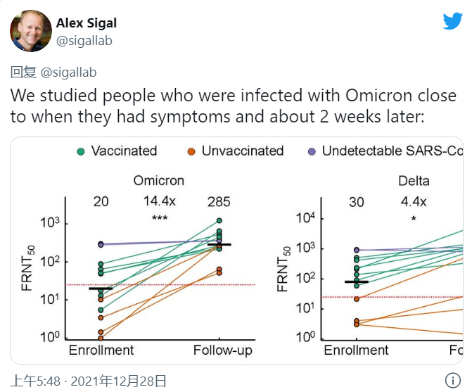 研究者发现奥密克戎的中和作用在14天内增加了14倍,同时他们也发现德尔塔病毒的中和作用增加了4.4倍。