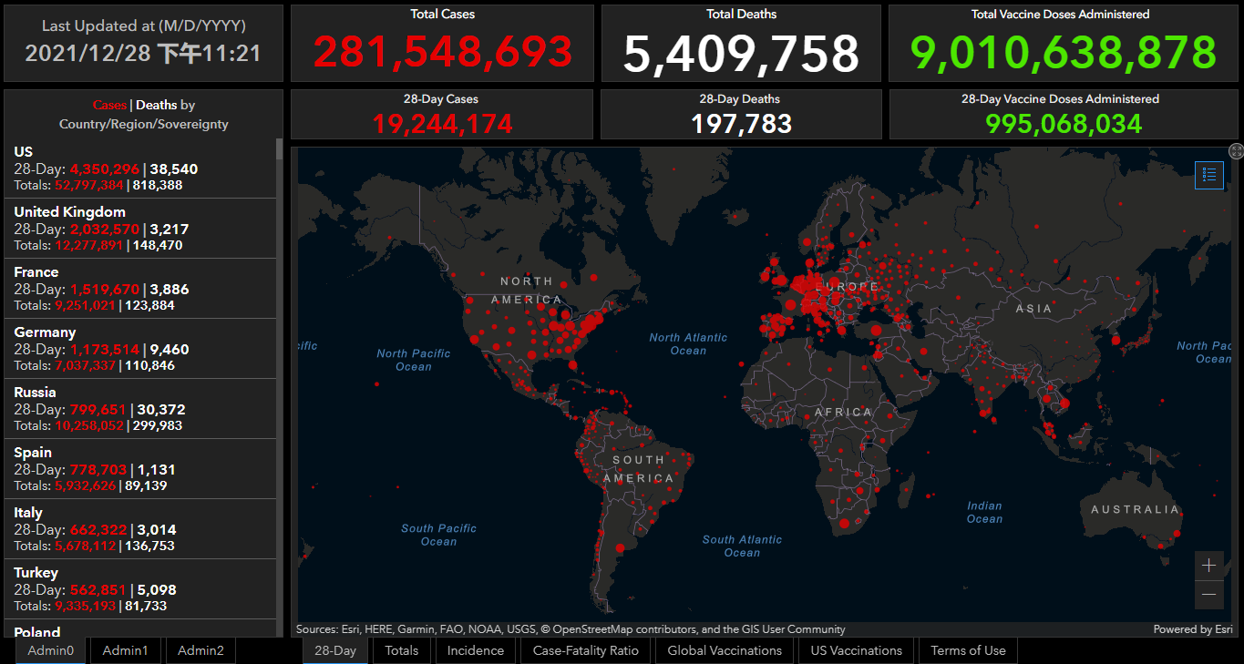 财联社(上海,编辑 赵昊)讯,美国约翰斯·霍普金斯大学发布的统计数据显示,截至北京时间12月28日23时59分,全球新冠肺炎确诊病例上升至281,548,693例,其中死亡病例达到5,409,758例。