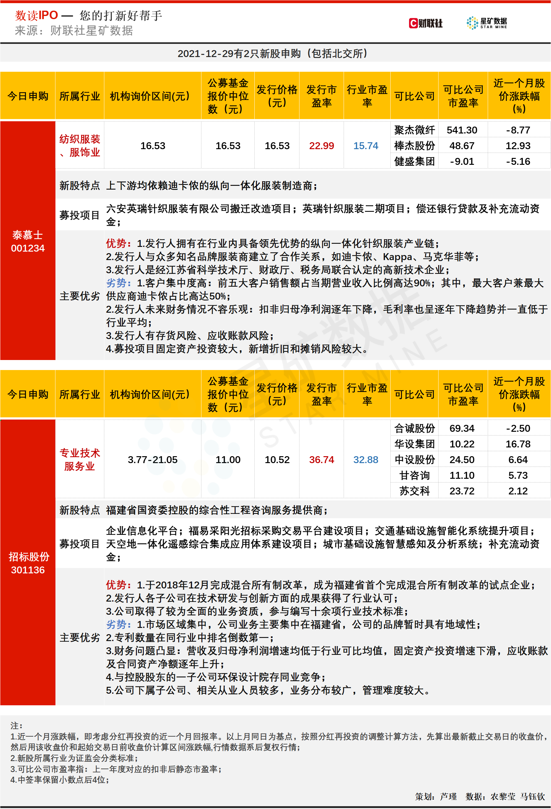 财联社12月29日讯,今日共计2只新股申购,分别是:深证主板的泰慕士、创业板的招标股份。