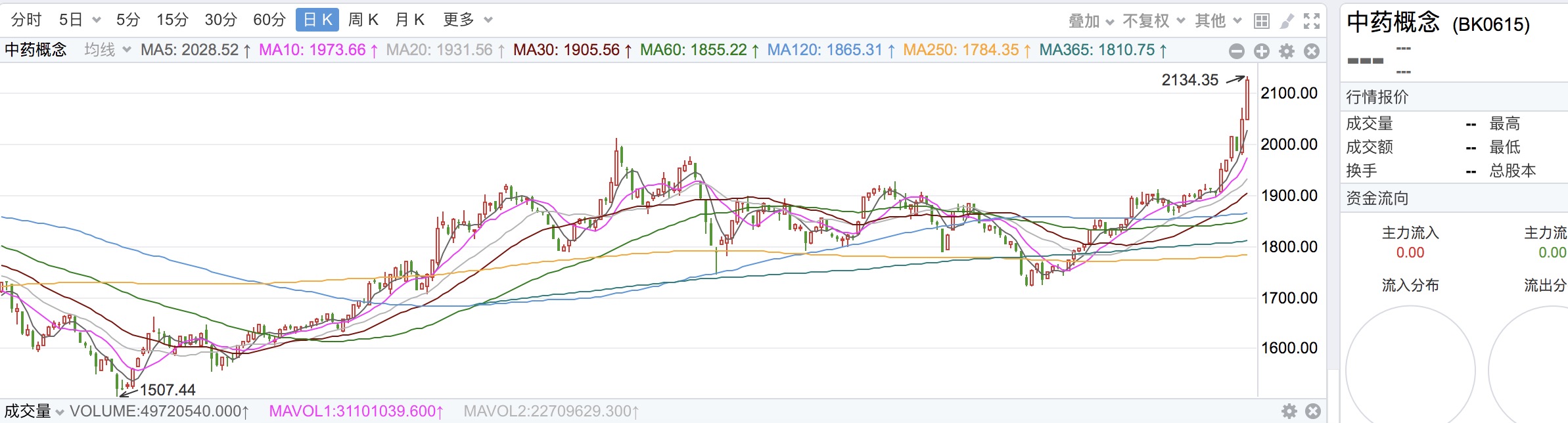 东吴证券分析师朱国广在日前出炉的研究报告中指出,中药股近期大涨背后的四大产业逻辑其一国家对中药产业扶持力度较大,2021年CDE中药受理号从2020年400多个增加到2021年1200多个;其二OTC类中药由于上游成本上升导致涨价,同仁堂(600085.SH)、太极集团(600129.SH)、广誉远(600771.SH)等可能出现不同程度涨价;其三进入基药的中药品种确保放量;其四中药治疗未病具有先天性优势,治疗未病已经上升国家战略。