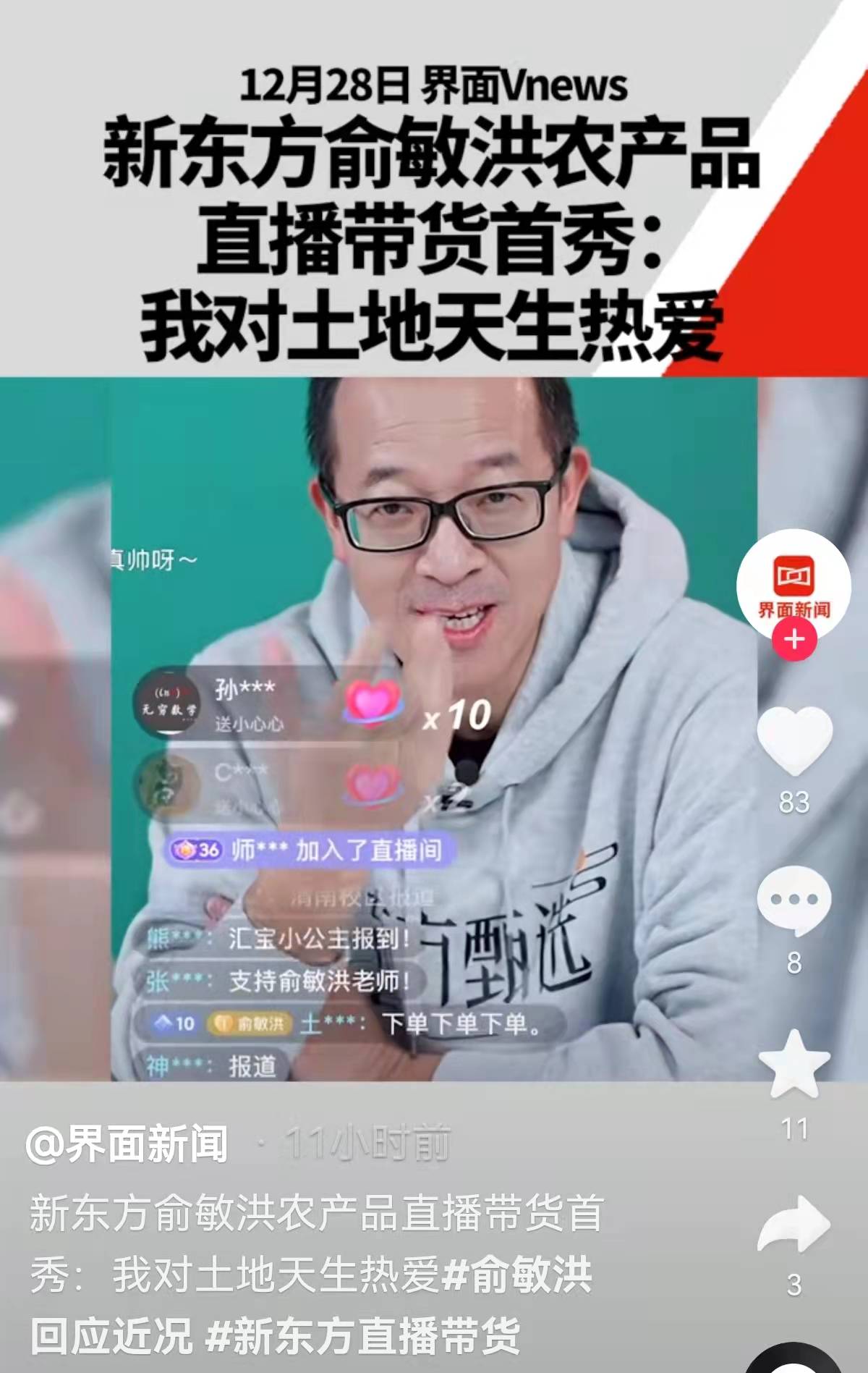 同时新东方创始人俞敏洪在直播中介绍了新东方的农产品直播带货平台“东方甄选”。