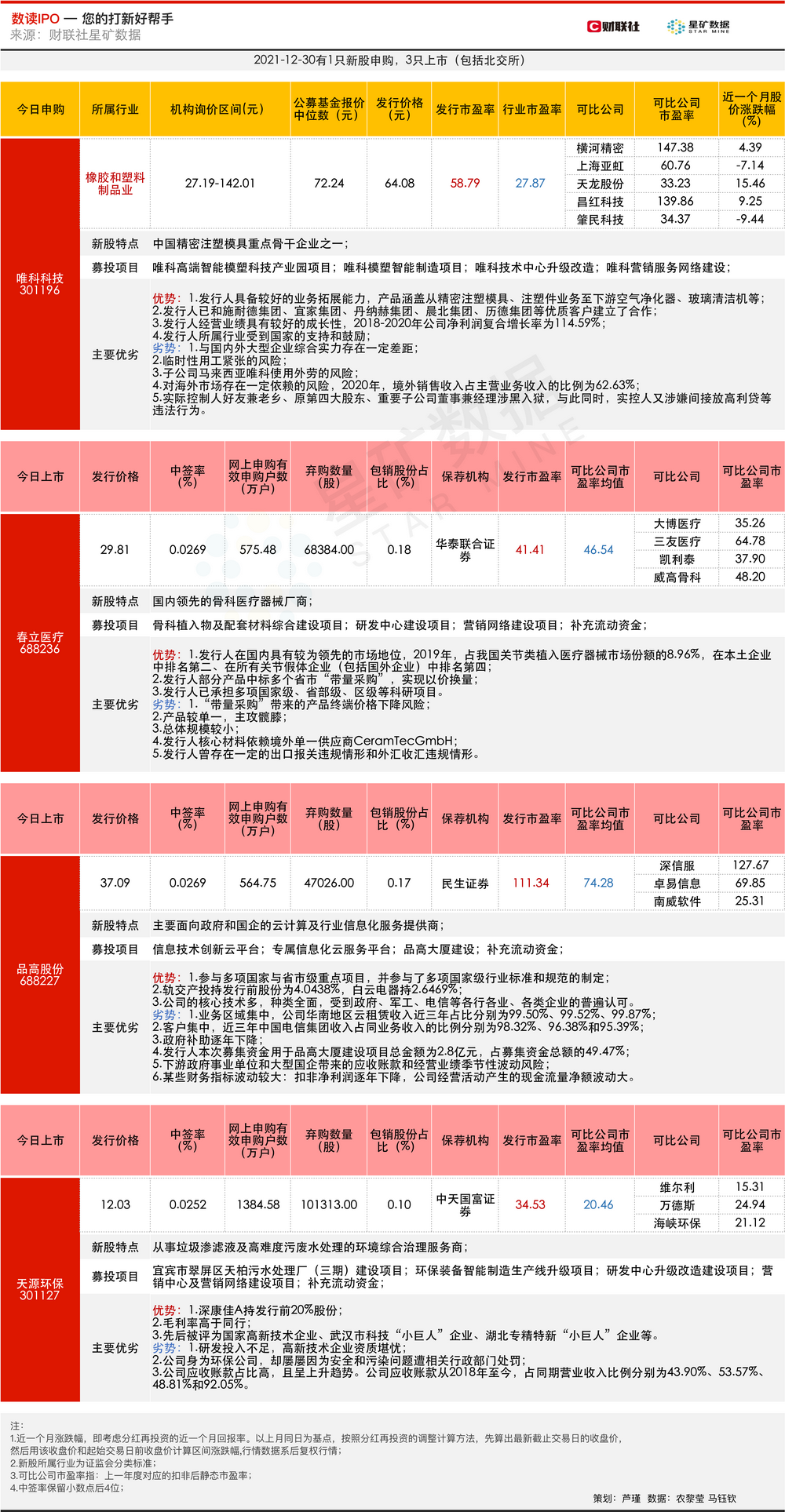 财联社12月30日讯,今日共计3只股票上市,分别是:科创板的春立医疗、品高股份,创业板的天源环保;另有一只股票申购,为创业板的唯科科技。