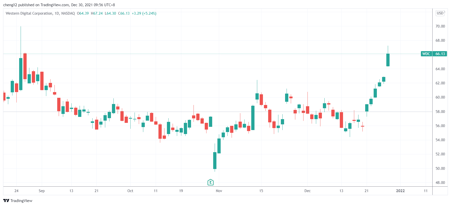 在全球存储半导体短期供应面临不确定性的背景下,美股存储半导体概念股持续走高。周三西部数据收涨5.24%,涨幅位列标普500成分股第二,仅次于出现收购传闻的渤健(BIIB),个股连涨六天,累计涨幅也达到18%。隔夜美光科技亦上涨逾3%,迫近互联网泡沫时期的高点;而希捷科技涨1%续刷收盘历史新高。