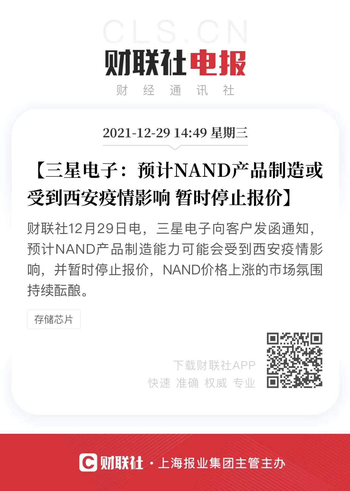 根据财联社昨日的报道,三星电子已经于昨日向客户发函,暂时停止NAND产品的报价。