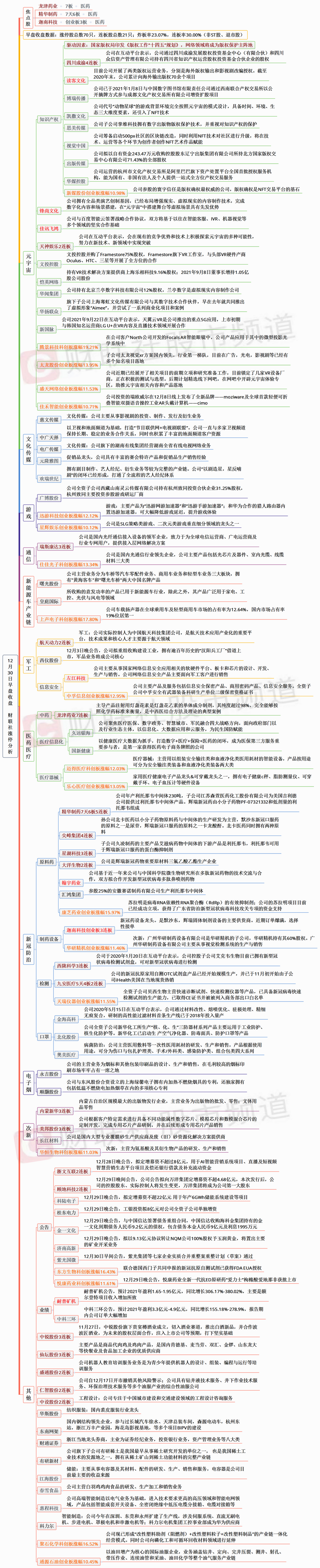 总之,今日早盘亮点要数元宇宙概念的大幅上涨,带动游戏、虚拟数字人等板块集体走高。元宇宙赛道持续活跃,新时代证券指出,展望2022年应逐步加强配置传媒互联网,把握元宇宙大时代。虽然当下的产业发展处于早期,但发展迅速,早期投资应把握最有业绩支撑且最有可能转到元宇宙的数字娱乐内容,比如数字游戏,虚拟人及偶像,展览展示等。今日板块继续轮动,昨日涨幅居前的中船系、盐湖提锂等板块集体回落,高位人气股方面,龙津药业成功晋级7连板,精华制药获5连板,九安医疗继续涨停5天4板,昨日18只连板个股中12只今日继续涨停。