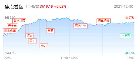 财联社12月30日讯,今日三大指数全线收涨,创业板指涨超1%。沪深两市今日成交额10178亿,较上个交易日放量205亿,成交量重回万亿水平上方。板块上,元宇宙、医药医疗板块再度走强。个股上,九安医疗再度涨停,34个交易日涨超700%。昨日18只连板个股中13只今日继续涨停,但此前市场连板龙头三羊马尾盘跌停。