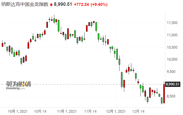 中概股暴涨,纳斯达克金龙指数收涨9.40%,收于8990.51点,创2008年以来最大单日涨幅,盘中一度涨超10%。