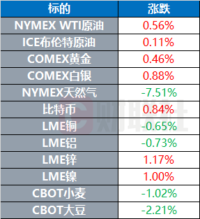 能源方面,美国WTI原油期货走出七连阳,收涨0.56%,报每桶76.99美元;布伦特原油期货也收涨0.11%,报每桶79.32美元。美国天然气价格大跌7.51%,报3.56美元/百万英热,为6月25日以来的最低收盘价。