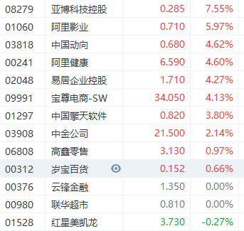 阿里概念板块今日高开高走,其中阿里巴巴-W(09988.HK)和亚博科技控股(08279.HK)涨幅居前,涨幅分别为8.19%和7.55%。