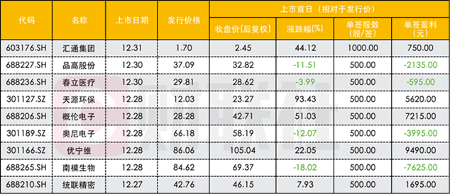 本周(12月27日至12月31日),9只新股上市后表现如下表所示:
