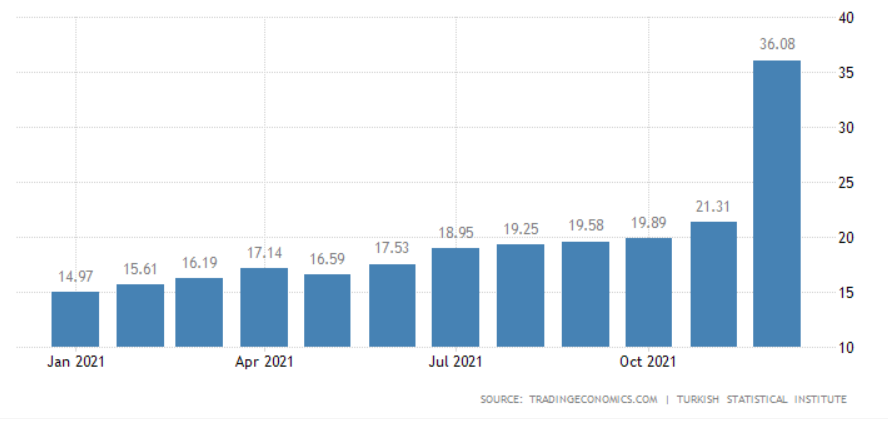36%的通胀也是该国自2002年9月(37%)以来的新高,自然也是埃尔多安的正义与发展党在2002年底赢得大选后的最高数据。在Trading Economics的排行榜中,土耳其也凭借最新数据挤掉伊朗上升至全球通胀第八高的位置,排在其身前的是多年身陷通胀危机的阿根廷(50%)。