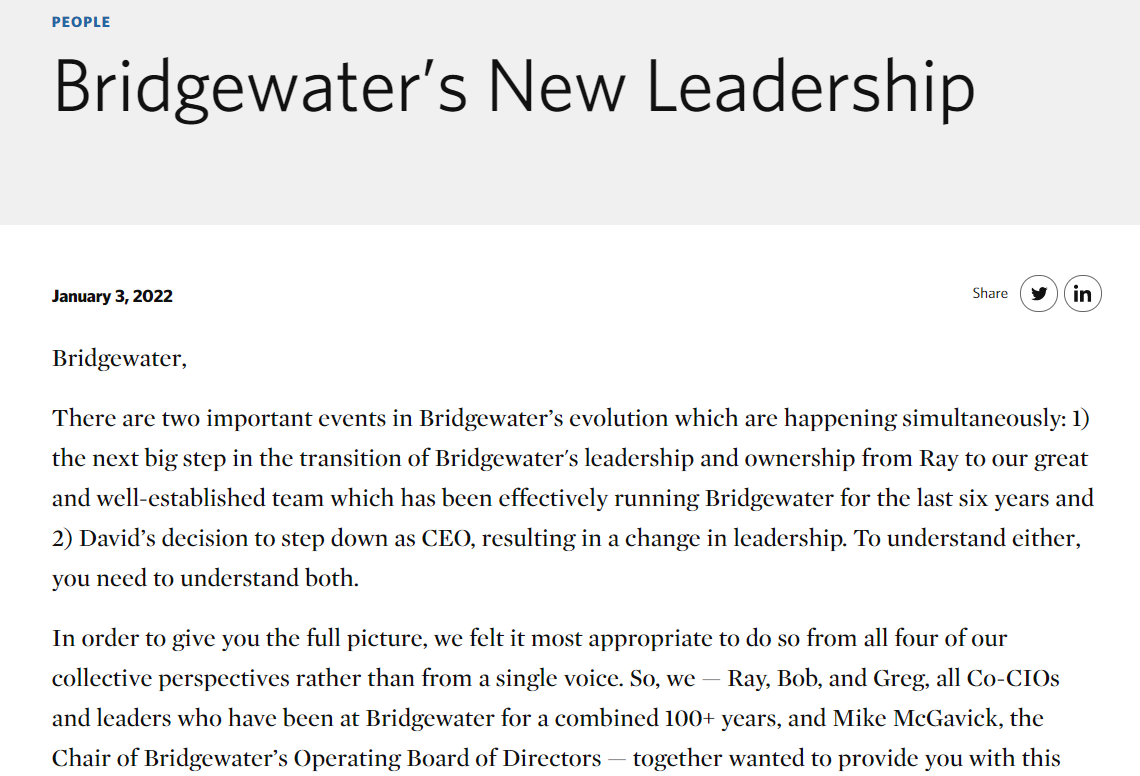 在周一这封达利欧与另外两名联席首席投资官Greg Jensen和Bob Prince,以及桥水运营董事会主席Mike McGavick的声明中也表示,作为一家强势创始人创立的具有强大文化的企业而言,想要转型并不容易,特别是在过去两年这样充满挑战的时期。