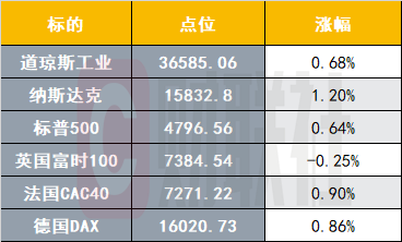美股三大股指集体走高,截至收盘,标普500指数涨0.64%,报4796.56点;纳斯达克指数涨1.20%,报15832.80点;道琼斯指数涨0.68%,报36585.06点。美国科技龙头今天多数走强,经济重启概念也在假期后继续上攻,中概股涨跌不一。