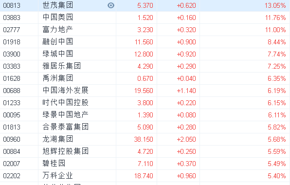 财联社(上海,编辑 胡家荣)讯,港股市场上,内地房企板块周二集体反弹,截止发稿,世茂集团(00813.HK)、富力地产(02777.HK)、中国奥园(03883.HK)分别上涨13.05%、11.76%、11%。