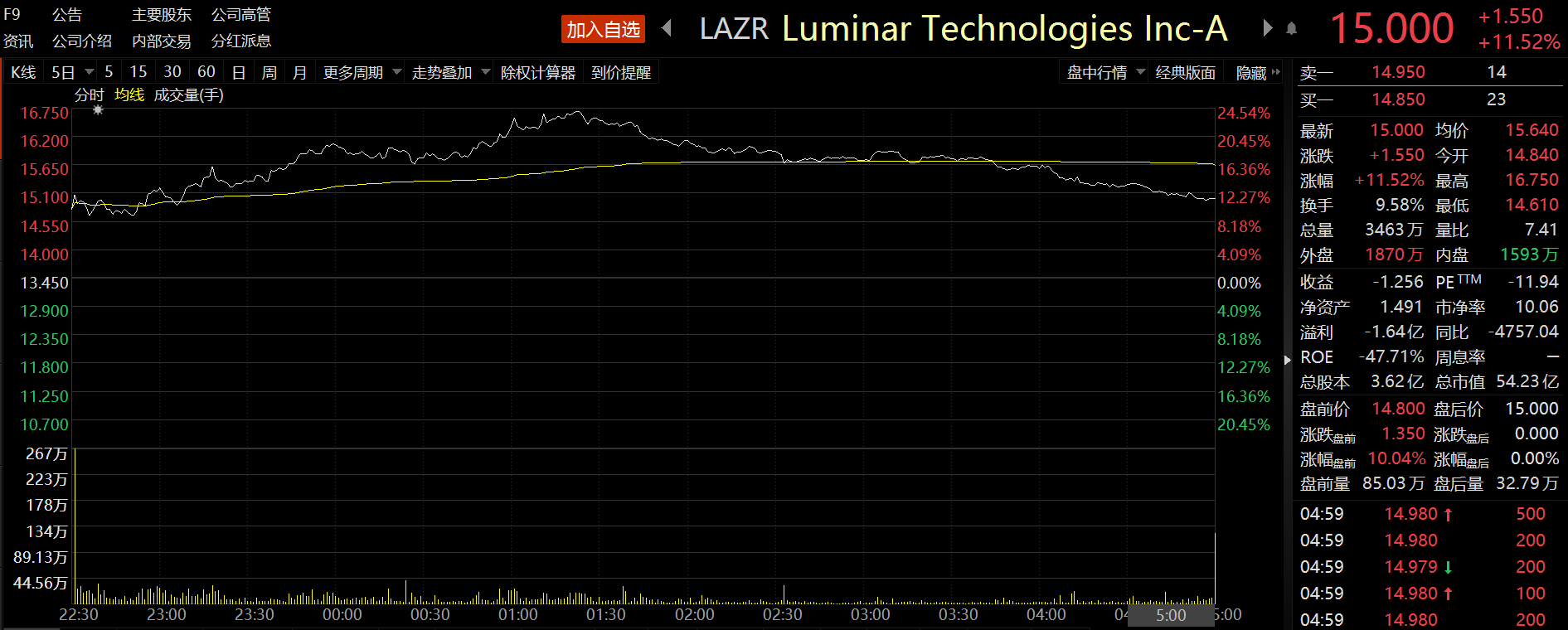 消息宣布后,Luminar美股盘中一度涨近25%,创下近两个月以来单日最大盘中涨幅。