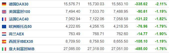 正在交易中的欧洲市场全线下挫,德国DAX指数跌幅逾2%,欧洲斯托克50指数下跌1.79%,法国CAC40指数下跌1.82%。