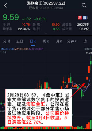 上市公司中,海联金汇在数字货币领域处于部分零售小场景试验应用阶段,公司股价随后持续拉升,截至3月4日收盘,5日最高涨22.76%。