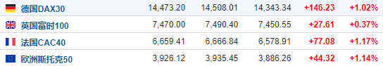欧股方面,德国DAX指数涨1.02%,英国富时100指数涨0.37%,法国CAC40指数涨1.17%,欧洲斯托克50指数涨1.14%。