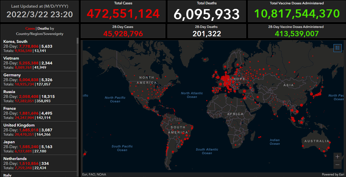 财联社(上海,编辑 赵昊)讯,美国约翰斯·霍普金斯大学发布的统计数据显示,截至北京时间3月22日23时45分,全球新冠肺炎确诊病例上升至472,551,124例,其中死亡病例达到6,095,933例。