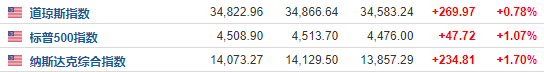 欧美主要股指集体上涨。截至发稿,道琼斯指数涨0.78%,标普500指数涨1.07%,纳斯达克指数涨1.70%。纳斯达克中国金龙指数涨8.58%。