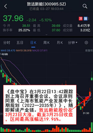 《盘中宝》前瞻解读氢能源题材,在3月22日13:42发布文章《一批重大项目相继开工,市场或仍有5倍增长空间》,梳理出“上海重要会议原则同意《上海市氢能产业发展中长期规划(2022—2035年)》”的重要线索,并引用券商观点解读氢能领域的投资逻辑。