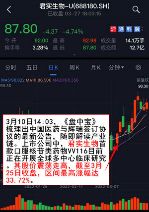上市公司中,君实生物首款口服核苷类药物VV116目前正在开展全球多中心临床研究。其股价震荡走高,截至3月25日收盘,区间最高涨幅达33.72%。