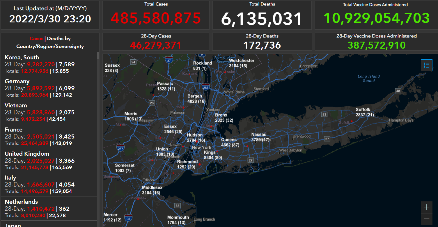 财联社(上海,编辑 史正丞)讯,截至北京时间3月30日23点50分,全球新冠肺炎确诊病例上升至485,580,875例,其中死亡病例达到6135031例。