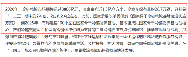 《盘中宝》在4月12日13:3梳理出冷链行业最新动态并汇总成文章《物流细分领域千亿赛道,多部门联手再出推进政策》,引用平安证券观点指出:冷链物流的发展与高质量生活、乡村振兴、扩大内需、健康中国等国家战略高度关联。在“十四五”规划目标顺利达成的条件下,冷链物流领域仍将维持较快速发展。