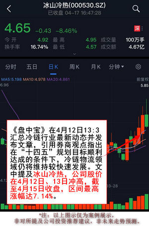 文中梳理出产业链上下游多家上市公司,其中冰山冷热联营公司松下冷链与京东自营、盒马鲜生、美团优选等电商均有业务合作,公司股价在4月12日、13日冲高,截至4月15日收盘,区间最高涨幅达7.14%。
