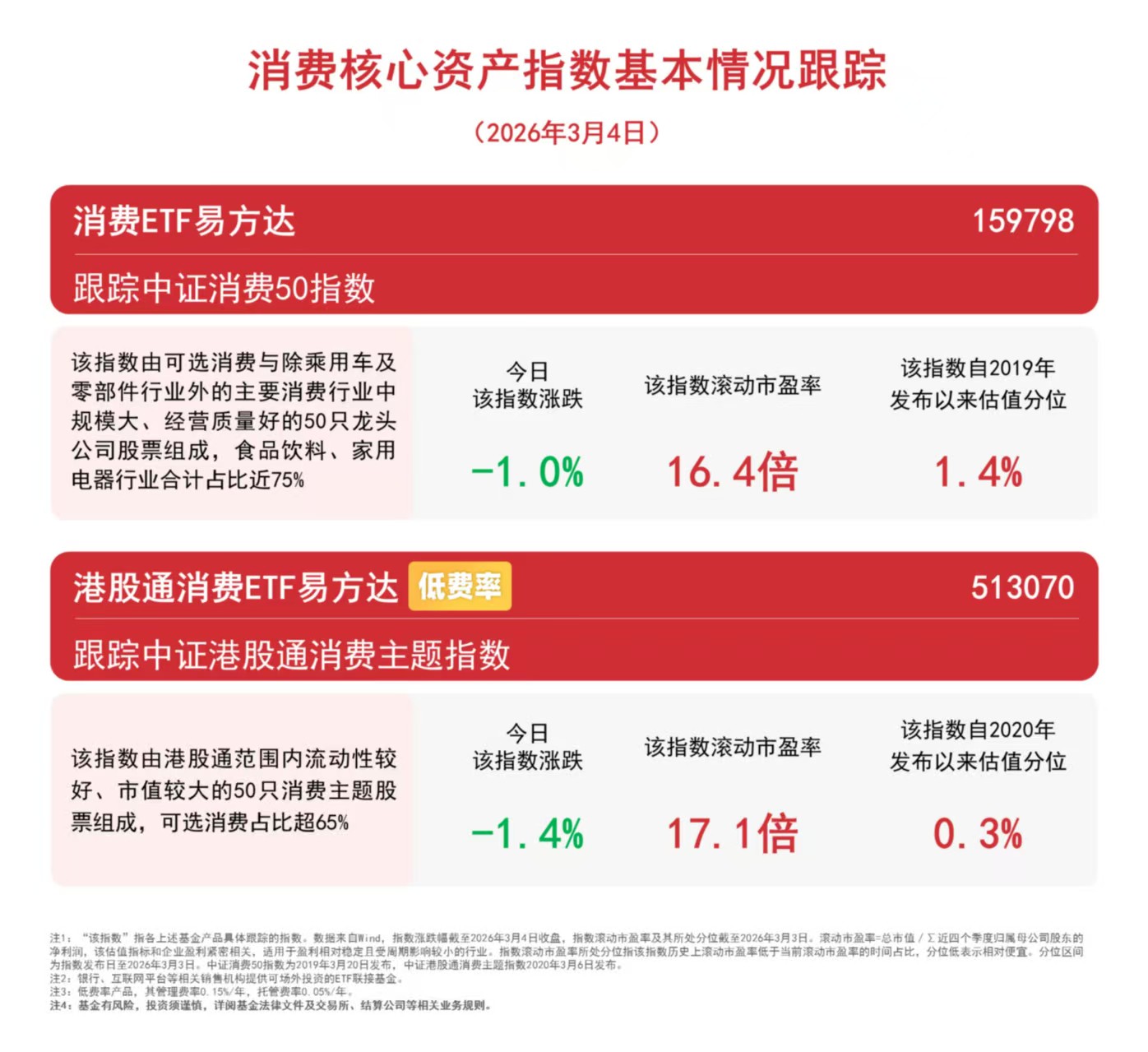 3月4日,消费板块低位震荡。截至收盘,中证消费50指数下跌1.0%,中证港股通消费主题指数下跌1.4%。Wind数据显示,截至昨日,港股通消费ETF易方达(513070)近一月合计“吸金”超12亿元。