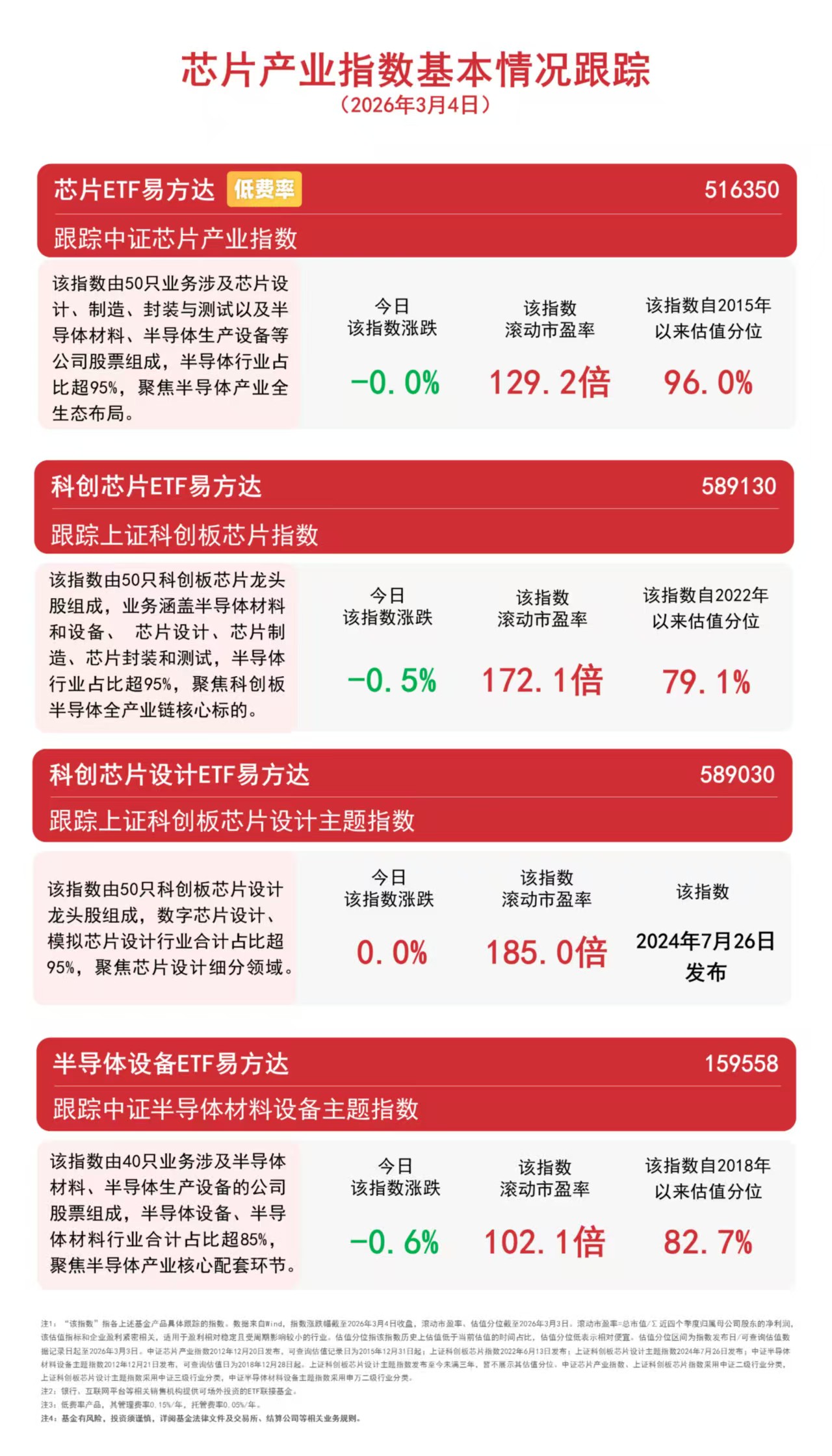 3月4日,市场延续调整,芯片产业链表现分化,模拟芯片、半导体设备回调,存储芯片逆势活跃。截至收盘,中证芯片产业指数下跌0.03%,上证科创板芯片设计主题指数上涨0.03%,上证科创板芯片指数下跌0.5%,中证半导体材料设备主题指数下跌0.6%。根据Wind数据,科创芯片设计ETF易方达(589030)昨日净流入超8000万份。