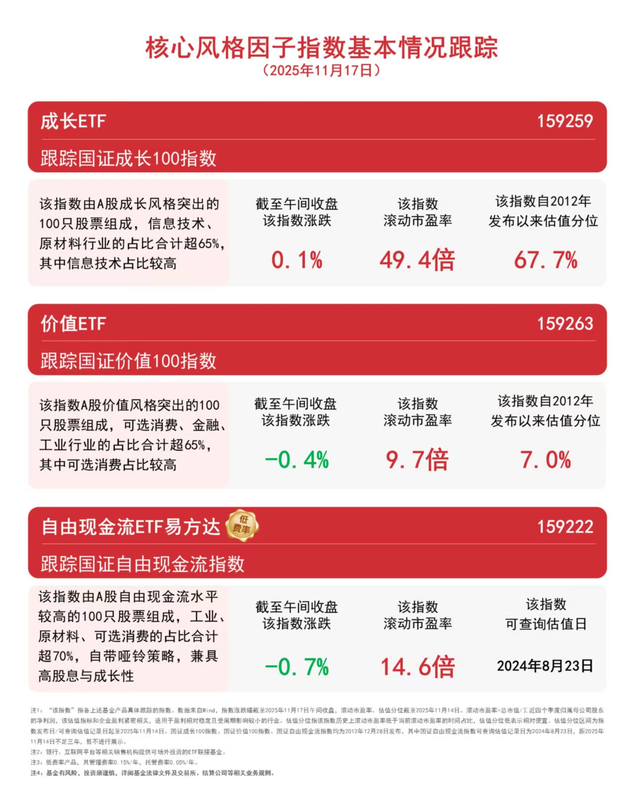 国证价值100指数采用“高分红+高自由现金流+低市盈率”三维筛选体系,优选价值标的,历史表现稳健;国证自由现金流指数则采用自由现金流率进行选样,兼具高股息与成长性。价值ETF(159263)和自由现金流ETF易方达(159222)分别跟踪以上指数,可助力投资者把握相关风格投资机遇。