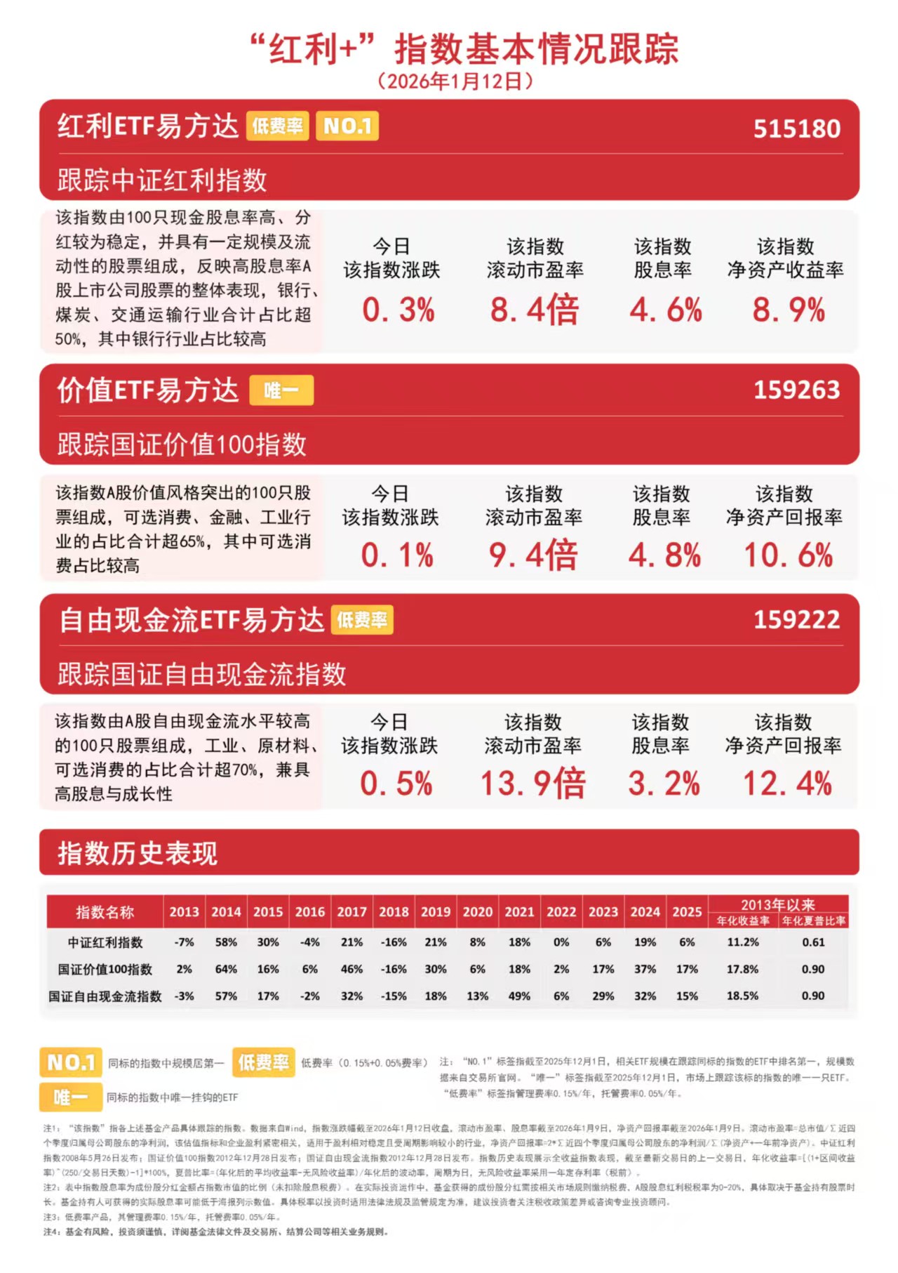 红利价值ETF易方达(563700)近日发布首次分红公告,投资者每持有10份基金份额可获得0.1元分红,权益登记日为1月13日,除息日为1月14日,现金红利发放日为1月19日。该产品跟踪的中证红利价值指数由50只股息率高且价值特征突出的股票组成,反映分红水平高且价值特征突出股票的整体表现,银行、建筑装饰、交通运输行业合计占比超七成,目前指数股息率达4.8%。